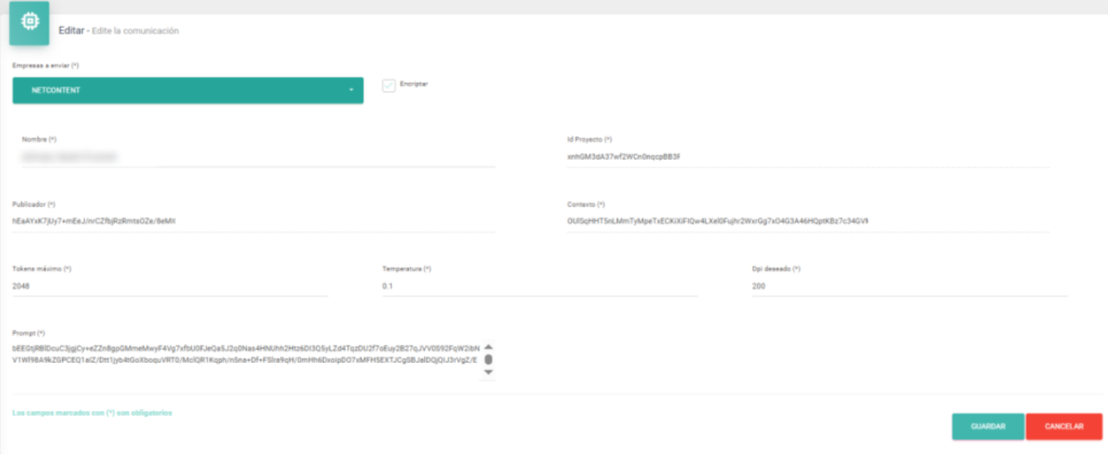 - Encriptar: Para evitar compartir información confidencial, al activar la encriptación, se ocultará los valores reales de los siguientes campos: Id Proyecto, Publicador, Contexto y Prompt.