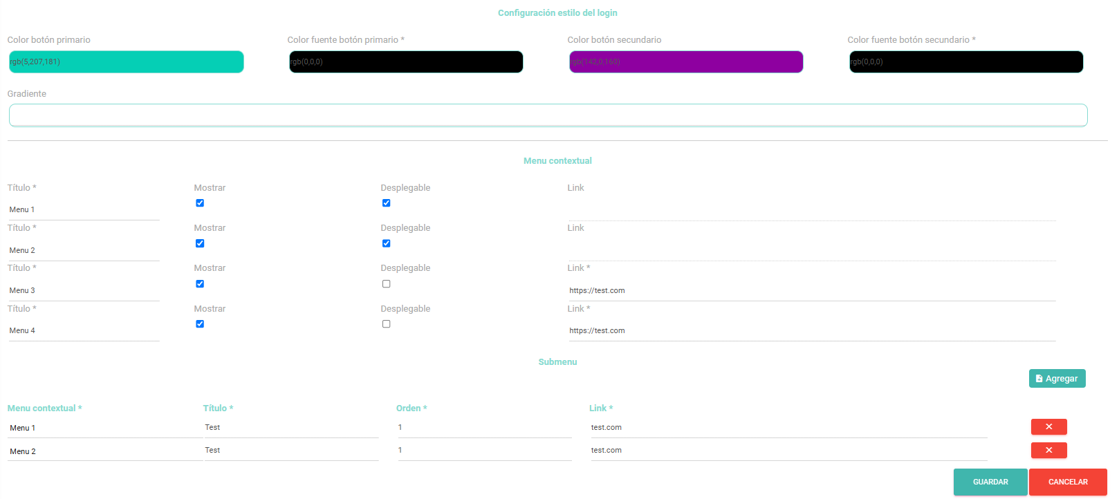 Es posible modificar los colores de los botones de inicio de sesión de Netcontent, a la vez que agregar nuevos menús a la pantalla de login con enlaces de utilidad y menús desplegables. Esta configuración se realiza desde Empresa.