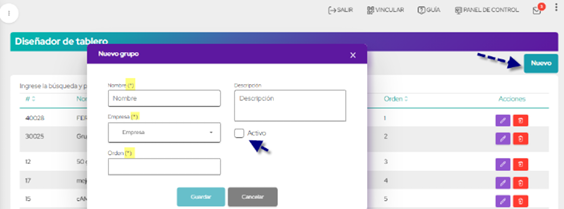 Para la creación de Nuevos Grupos, Acceder al menú Diseñador de Tablero, presionar el botón Nuevo, completar los campos requeridos e indicar si el grupo estará Activo. Presionar Guardar.