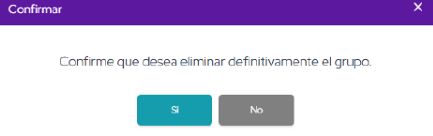 - Si se presiona Sí, el sistema verificará si existen widgets o comunicaciones asociadas. Si existen elementos asociados, se mostrará un mensaje informativo y no se eliminará el grupo, si no existen elementos asociados, se mostrará un mensaje de confirmación y el grupo será eliminado.