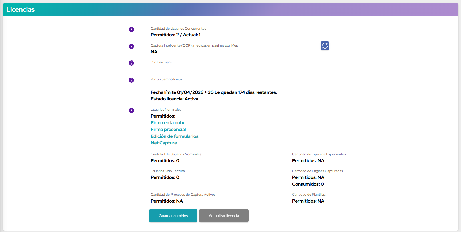 Indica la cantidad de páginas por mes permitidas para la captura inteligente de documentos a través del OCR del sistema. En caso de que se consuma la totalidad de páginas permitidas, quedarán inutilizables las funcionalidades que utilicen el OCR de la plataforma.
