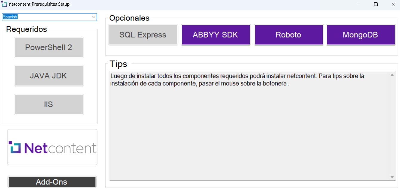 Se visualiza una ventana (Netcontent Prerequisites Setup) en donde se le solicita instalar los programas requeridos y los opcionales. Los botones de cada componente aparecen habilitados en caso de no estar instalados.