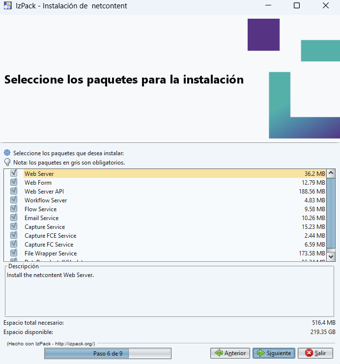 Para más información sobre la instalación de componentes no instalados coloque el cursor sobre cada botón.