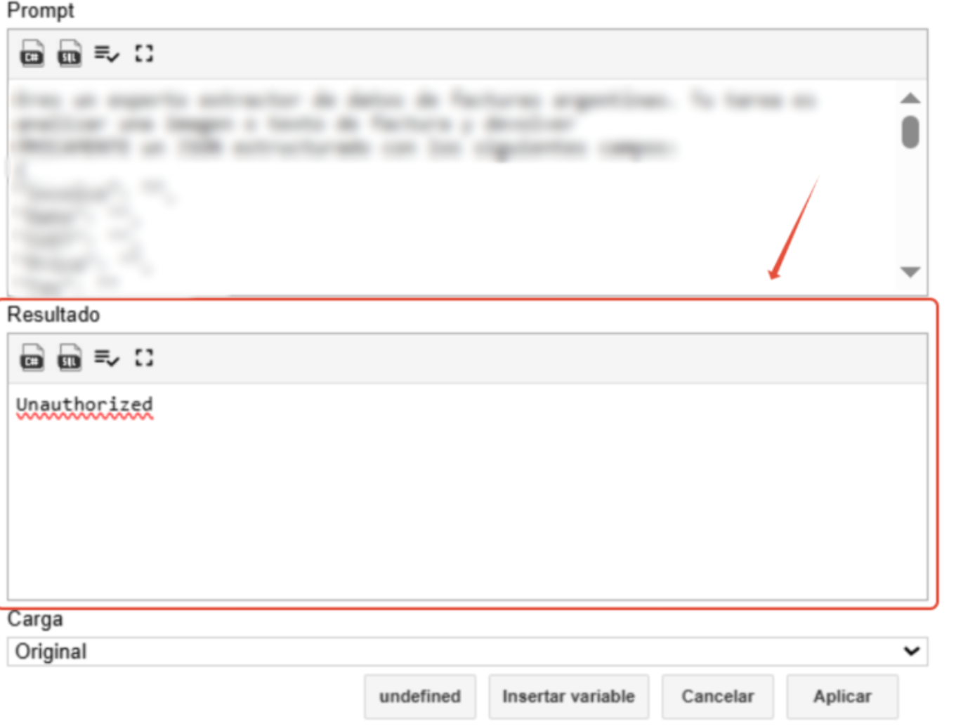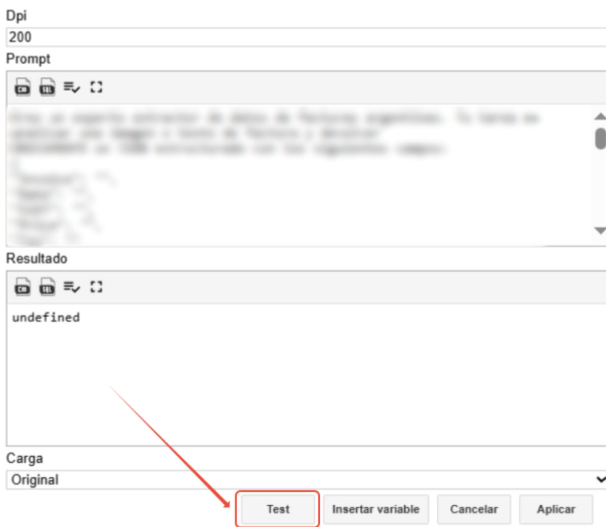 El valor del campo "Resultado" se completará al realizar click sobre el botón "Test", el cual nos permitirá realizar una prueba con nuestra IA y obtener una respuesta de error o de captura. Ejemplo:
